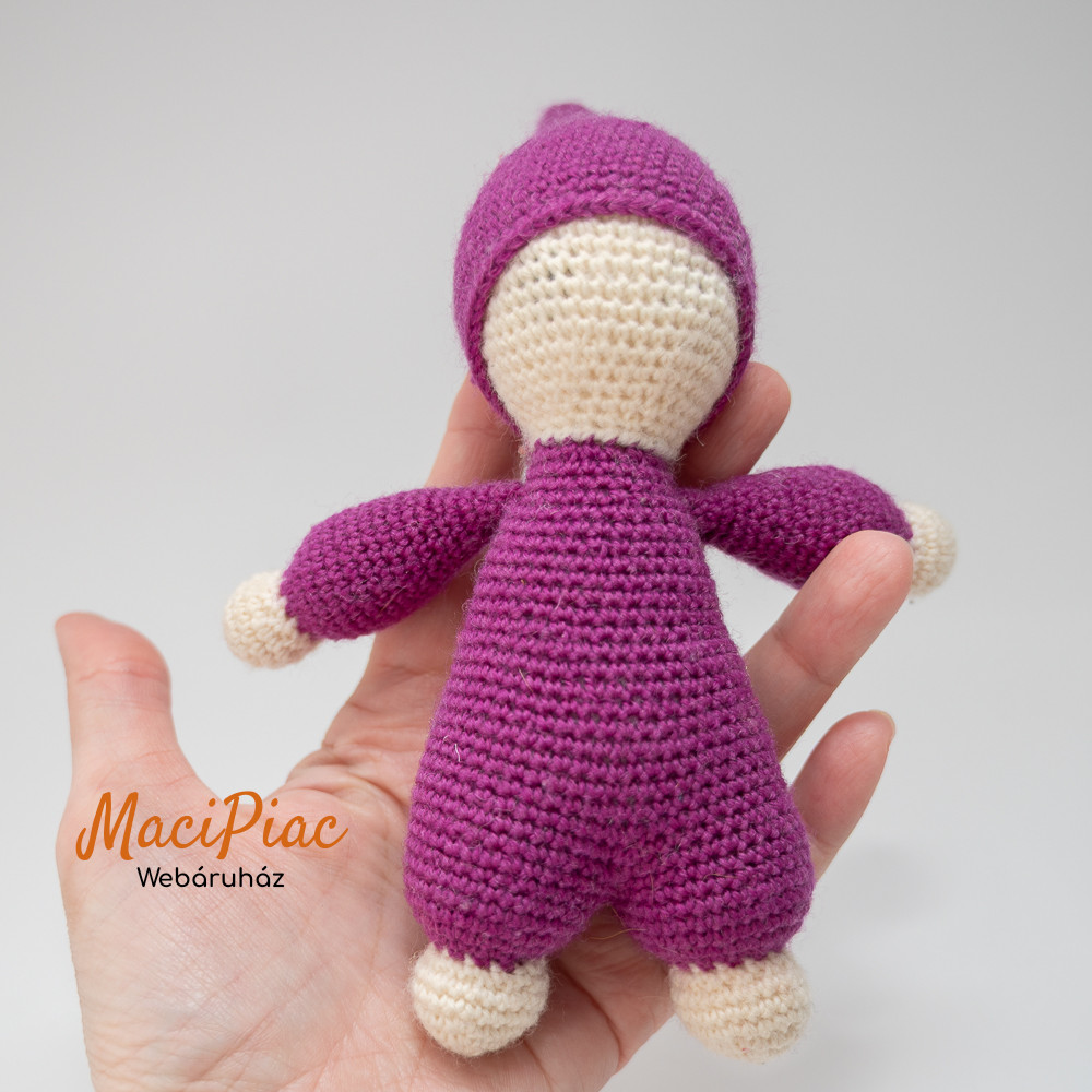 Amigurumi kézműves horgolt lila baba alvótárs kicsiknek
