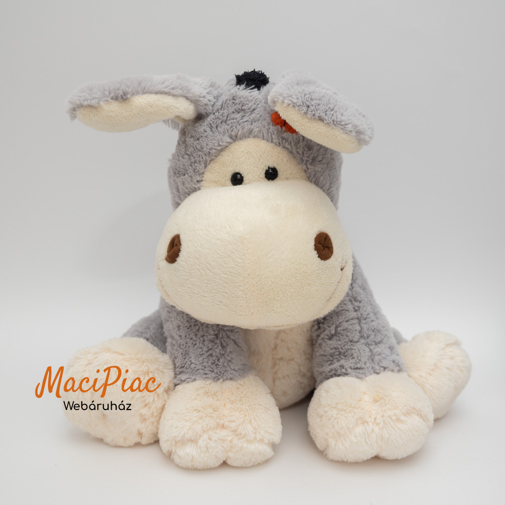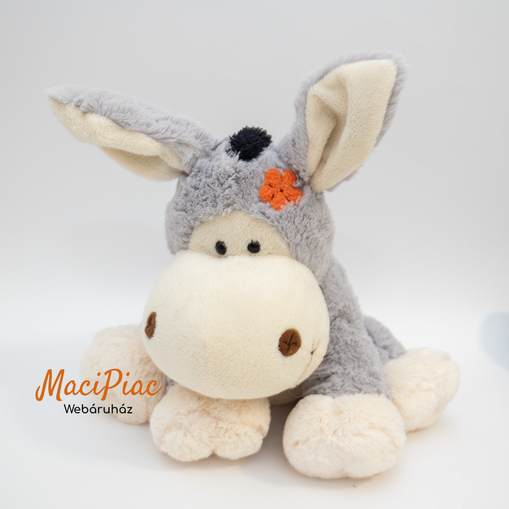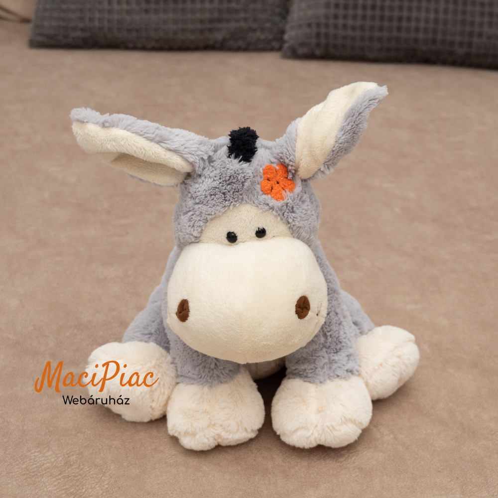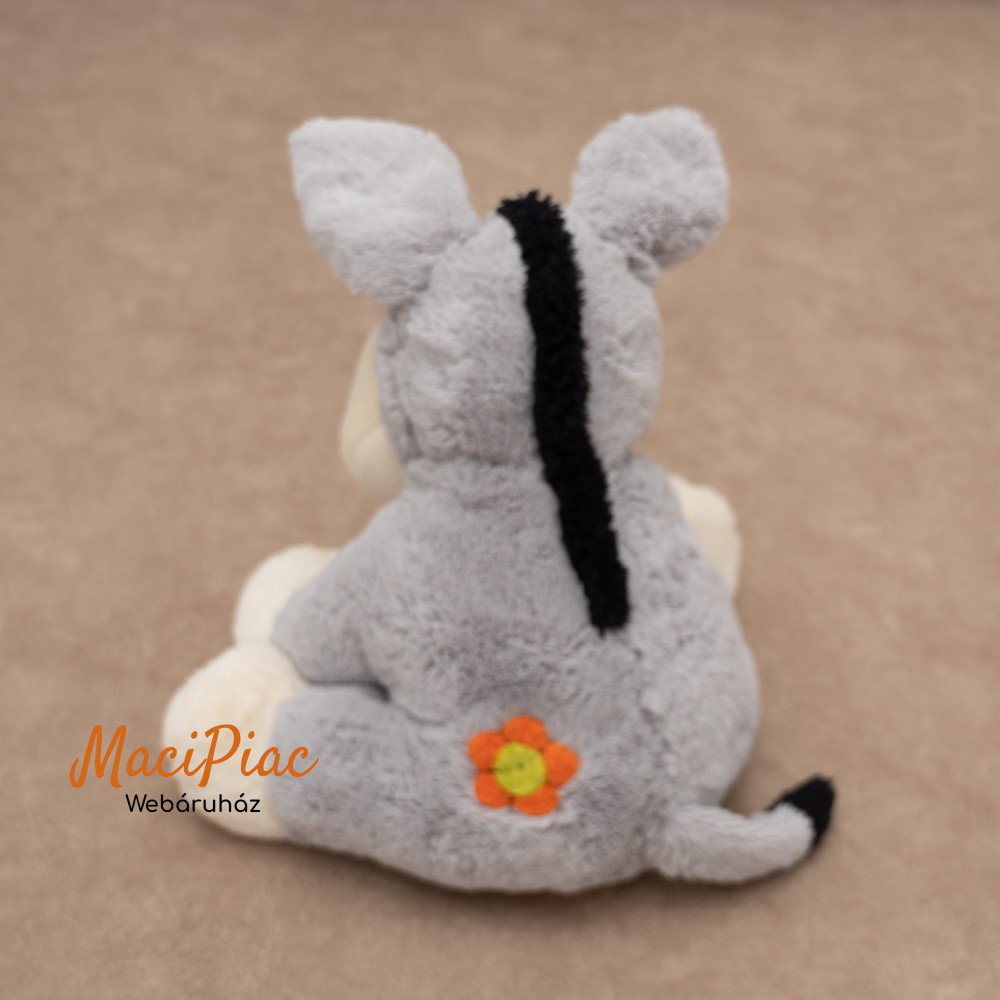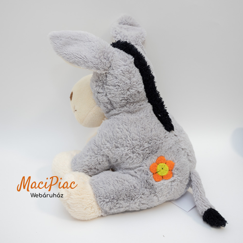 Szürke plüss szamár hímzett virággal a fején, fenekén fülei drótosak Ausztria